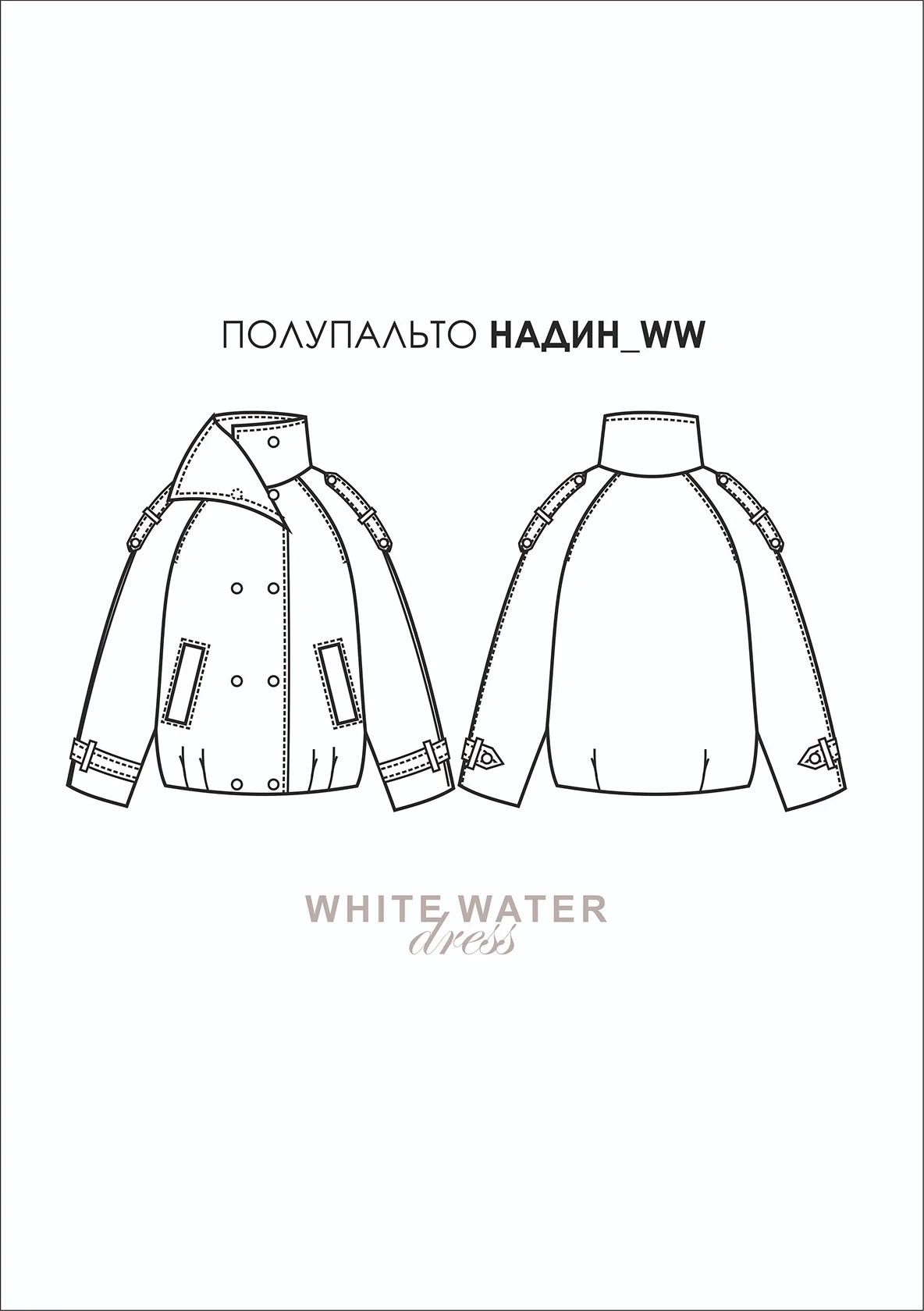 Выкройка двубортного полупальто "О" силуэта. Рукав реглан, высокий воротник стойка, защипы по низу изделия.